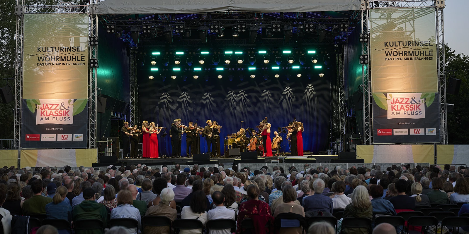 Die Atmosphäre muss man Erlangern nicht mehr erklären; für alle anderen sei verraten: Jazz und Klassik am Fluss ist ein Open-Air vor den Toren der Stadt, auf der Kulturinsel Wöhrmühle inmitten der Regnitz. Ein Sommerevent unter grünen Bäumen, mit untergehender Sonne, mit einem einzigartigen Flair.